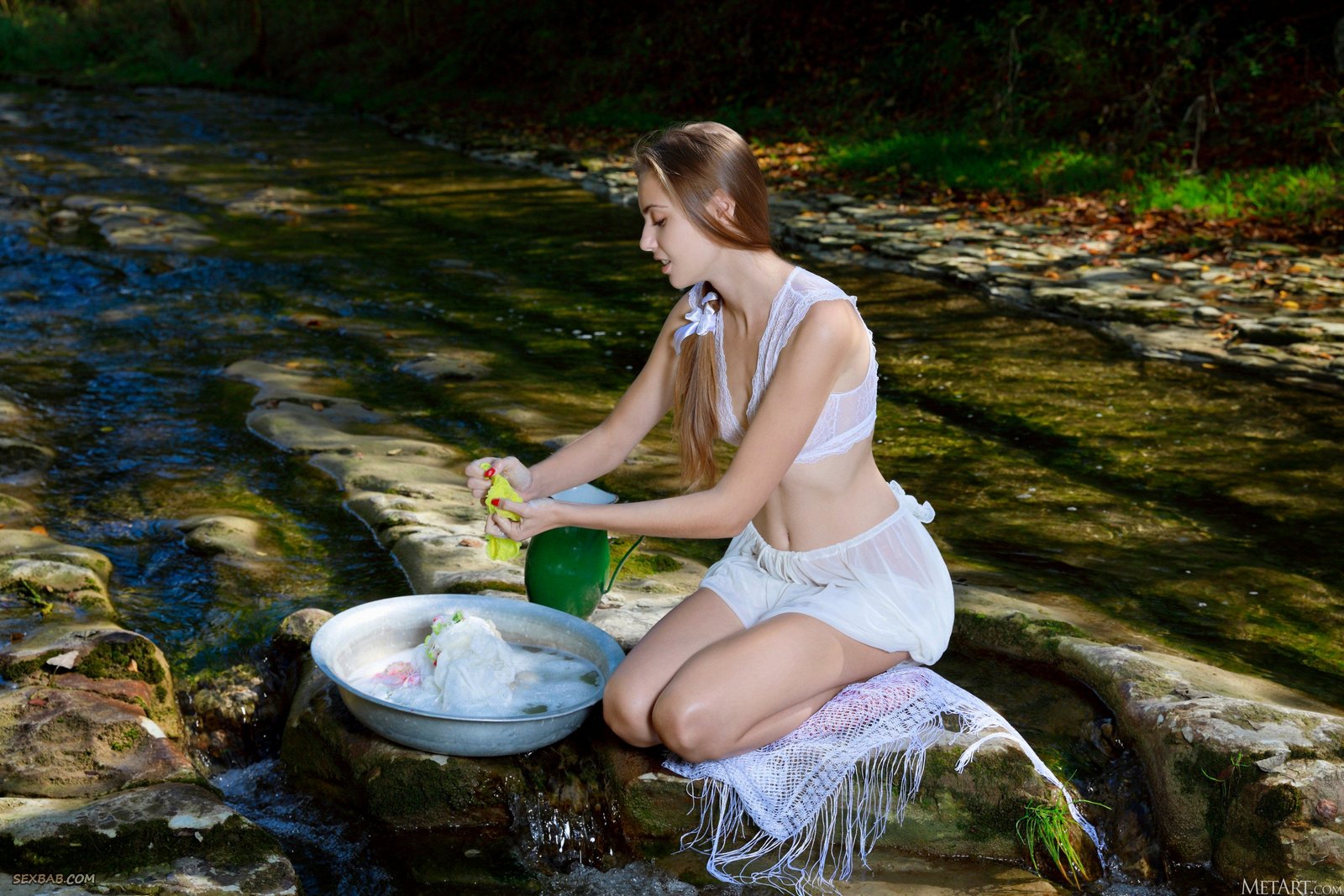 Описание: Вспотев от усердной работы и с удовольствием стянув с себя всю одежду, миниатюрная обнаженная девица стирает грязное белье в речке. Энергично извиваясь всем телом на неудобном камне, молодая красавица умудрилась во всей красе засветить перед нами свою бритую промежность с аккуратной розовой писечкой.