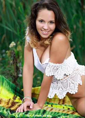 Описание: Игриво флиртуя со своим фотографом и возбуждающе медленно стягивая с себя одежду, миниатюрная гибкая девица устроила стриптиз на природе и, представ перед нами обнаженной, принялась открыто демонстрировать на камеру свое стройное молодое тело с похотливо раскрытой бритой промежностью.