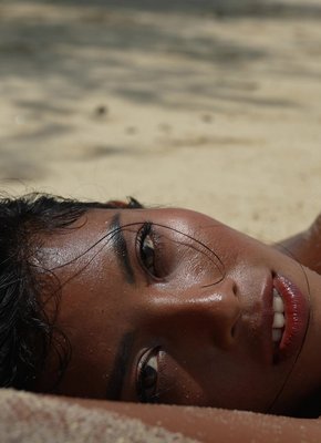 Описание: Эротично стянув с себя откровенный купальник, сексуальная горячая мулатка с аппетитной упругой попкой энергично позирует обнаженной на красивом пляже. Чувственно извиваясь всем телом на песке и испачкав в нем свои самые интимные места, смуглая брюнетка широко раздвигает перед нами длинные ноги и во всех подробностях показывает бритую темную пизду.