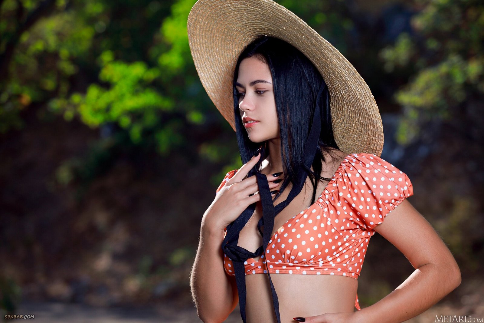 Описание: Кокетливо играясь перед камерой со своей большой шляпой, симпатичная молодая брюнетка в красивом купальнике бесстыже раздевается до гола и позирует на природе. Загорелая стройняшка с сочными упругими титьками ложится на большой горячий камень и развратно раздвигает длинные ноги, похотливо подставляя к камере свою бритую жадную пизду.