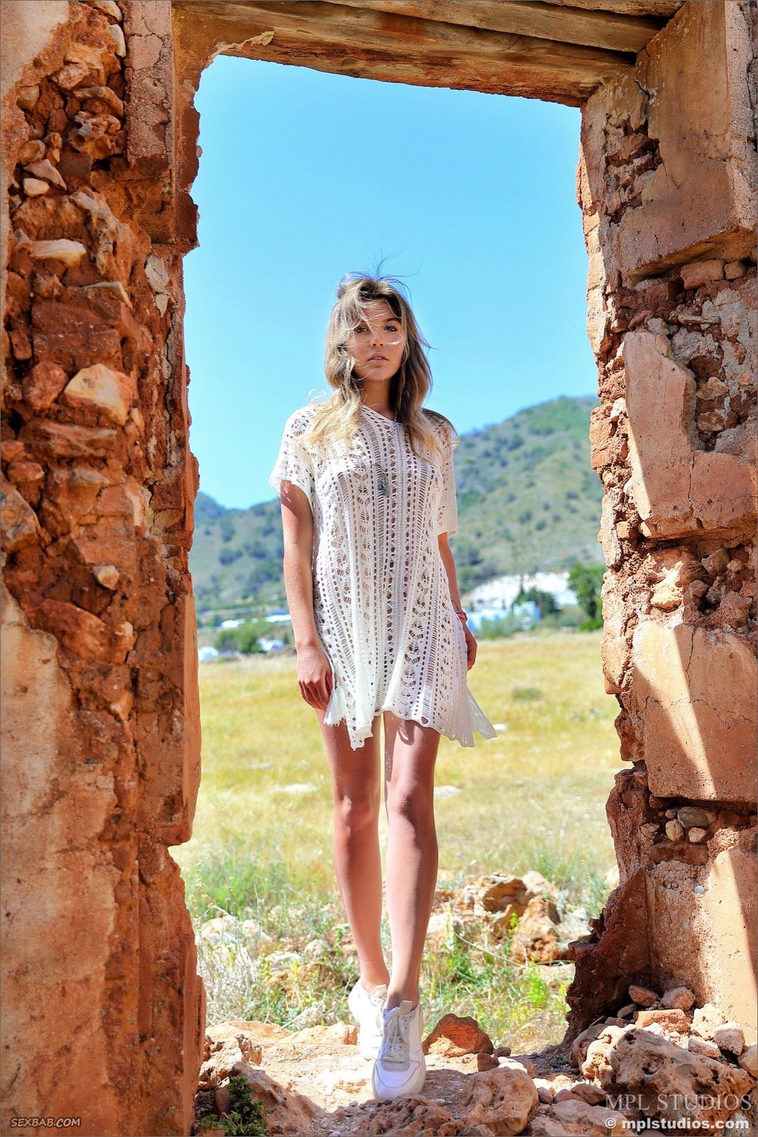Описание: Обворожительная стройная девица с красивой подкаченной попочкой, скинув с себя легкое платье, эротично позирует на развалинах. Наслаждаясь и нежно поглаживая ноги руками, сексуальная милашка в процессе продемонстрировала натуральные упругие сиськи и гладко выбритую письку с лобком.