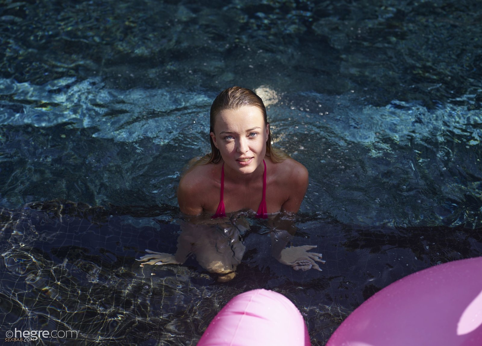 Описание: В большом открытом бассейне мокрая блондинка в маленьком розовом бикини наслаждается жаркой погодой и плавает на надувном фламинго. Сексуальная сучка снимает свой купальник на глазах у всех случайных людей и, расслабленно лежа на матрасе, подставляет свои маленькие титьки и аппетитную попку под солнечные лучи.