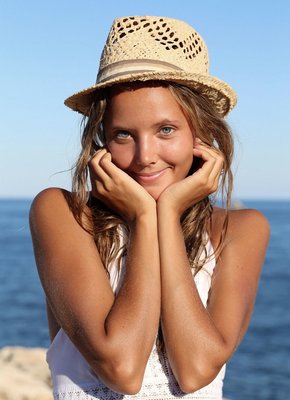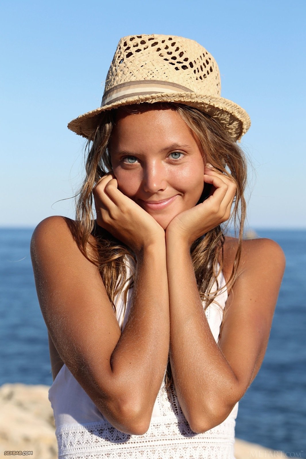 Описание: Скинув белое платье и шляпку, молодая девица с милым личиком и загорелым телом начинает эротично позировать у моря, улыбаясь и часто меняя разные возбуждающие ракурсы. Таким образом стройняшка больше всего засвечивала маленькие сиськи с бритой писькой и немного подкаченную попку.