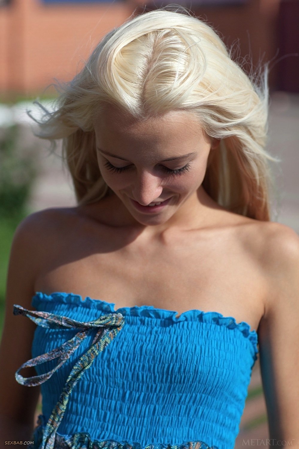 Описание: Симпатичная блондинка с худенькой талией, прогуливаясь на улице в платье без трусиков порой задирает его подол и показывает бритую сексуальную писю. Ощутив от демонстрации гениталий возбуждение, стройняшка в будущем расположилась на столе, стоящем в парке, и немного раздеваясь так же продемонстрировала маленькие сиськи.