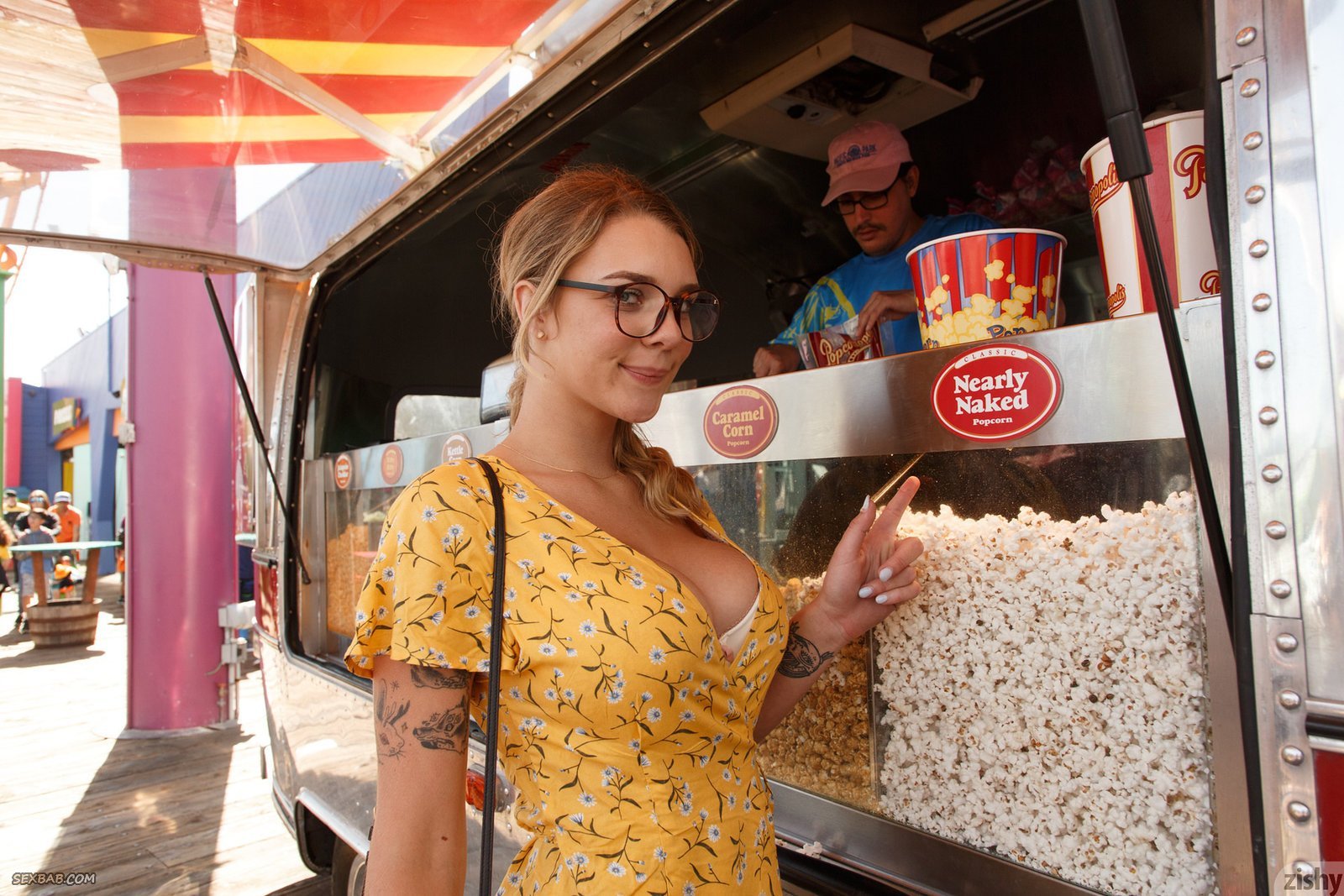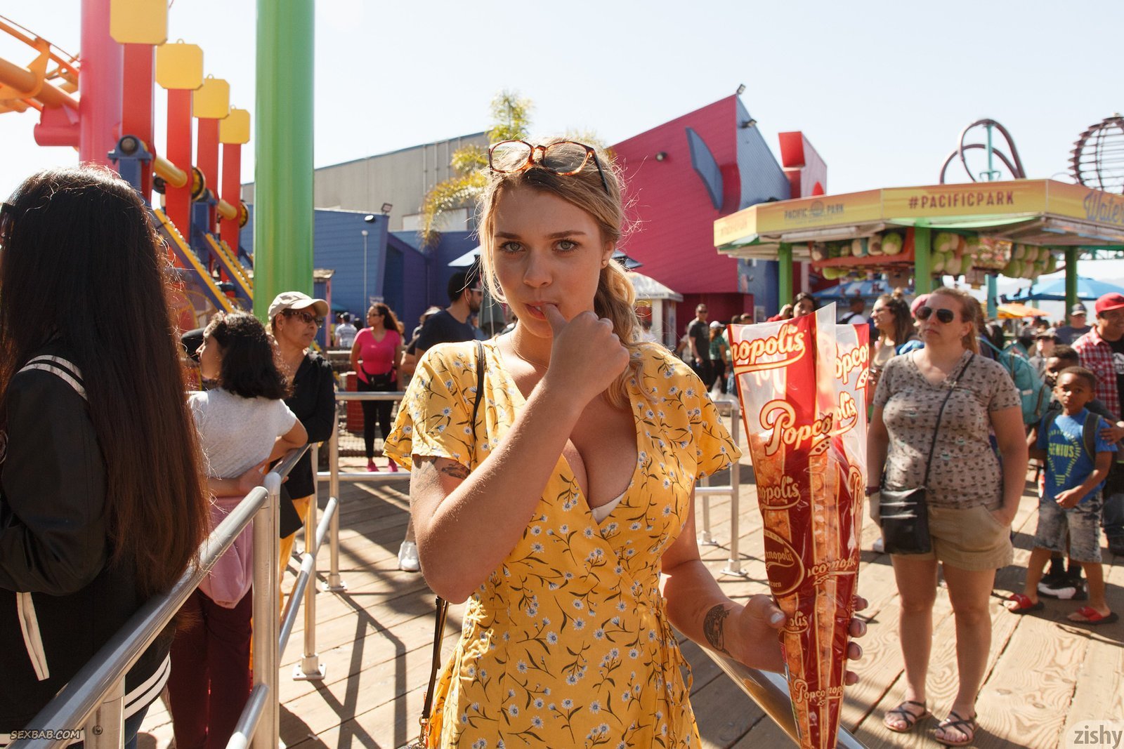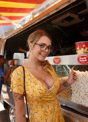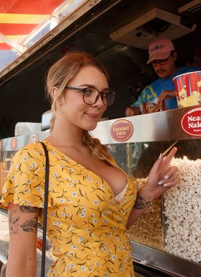 Описание: Обворожительная девушка с милейшей улыбкой гуляет в летнем платье с глубоким декольте, из которого буквально вылазят её огромные сиськи. Желая подогреть уровень нашего возбуждения, блондинка садится на корточки и открывает прелестный вид на трусики под юбкой, за которыми скрывается лоснящаяся щёлка, скучающая по мужскому вниманию.
