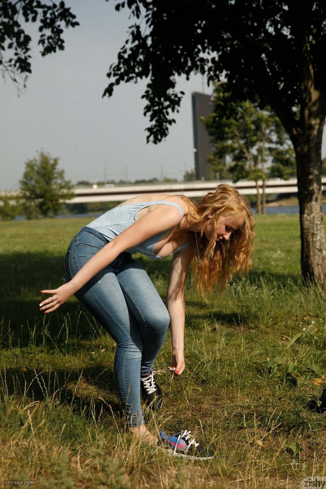 Описание: Наслаждаясь летним денем, гуляя на улице, в какой-то момент привлекательная девушка с вьющимися локонами оголяет сексуальные натуральные сиськи. В будущем молодая красотка снимает джинсы и в эротичном боди забирается по коленки в речку, продолжая засвечивать себя со всех сторон.