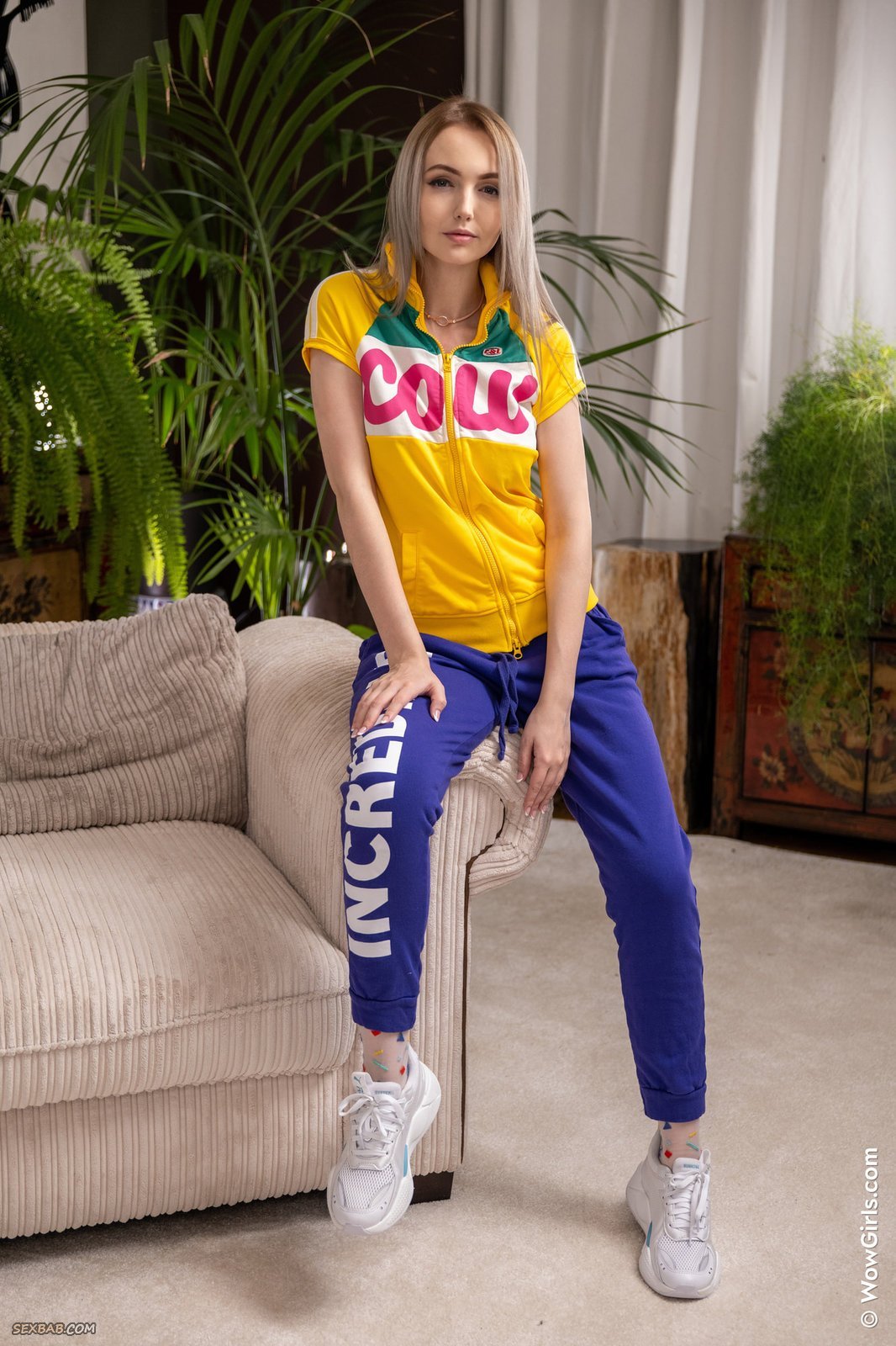 Описание: Уверенно чувствуя себя перед фотокамерой, красивая блондинка с худенько талией эротично позирует и снимает с себя красочный спортивный костюм. Оказавшись же голой, сексуальная девушка располагалась на диване и страстно трогая упругие буфера руками раздвигала промежность, позволяя нам рассмотреть получше её бритую письку.