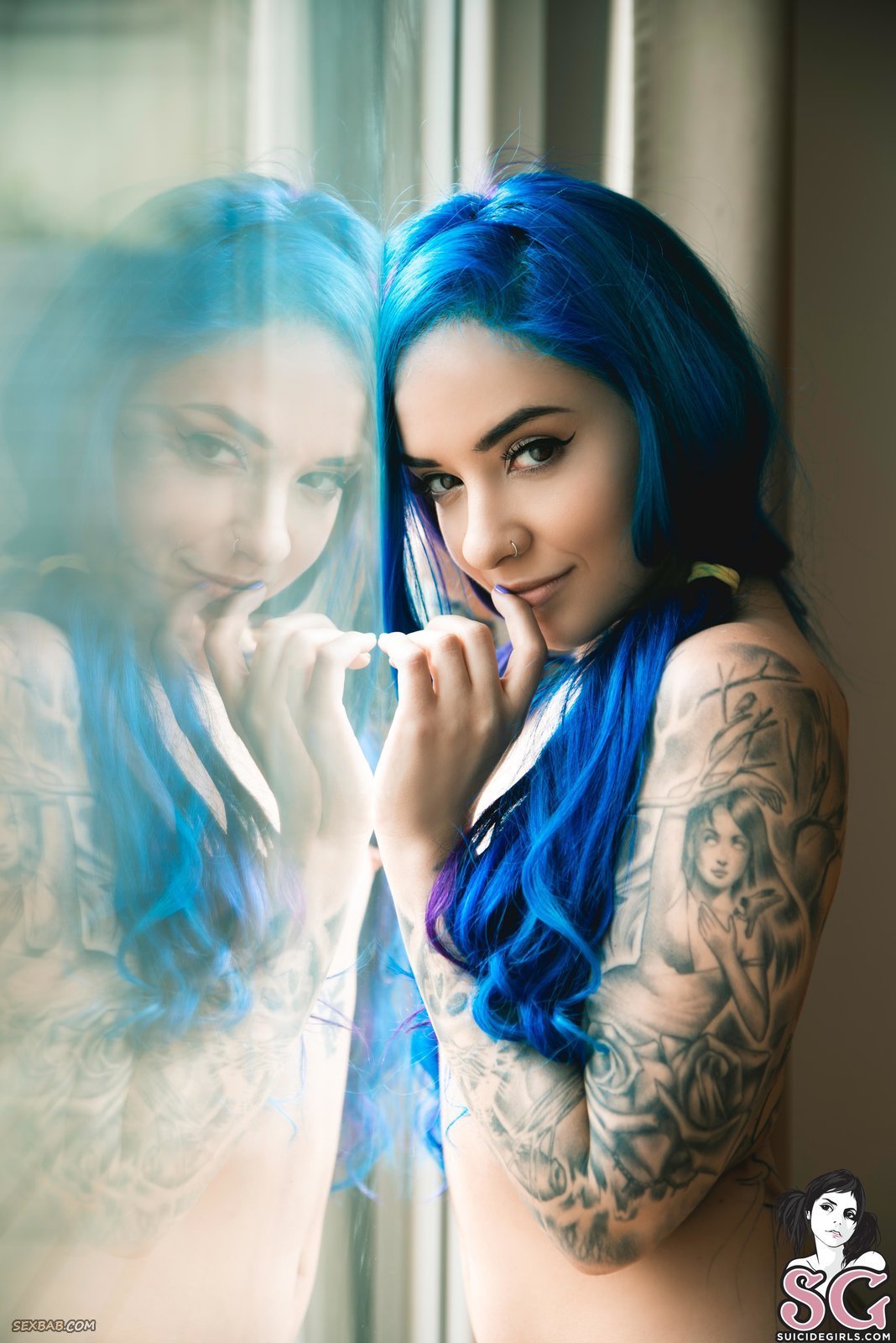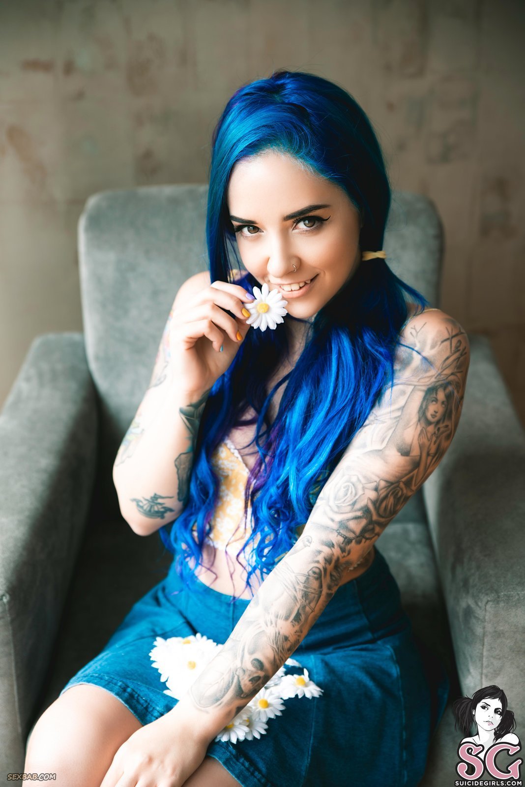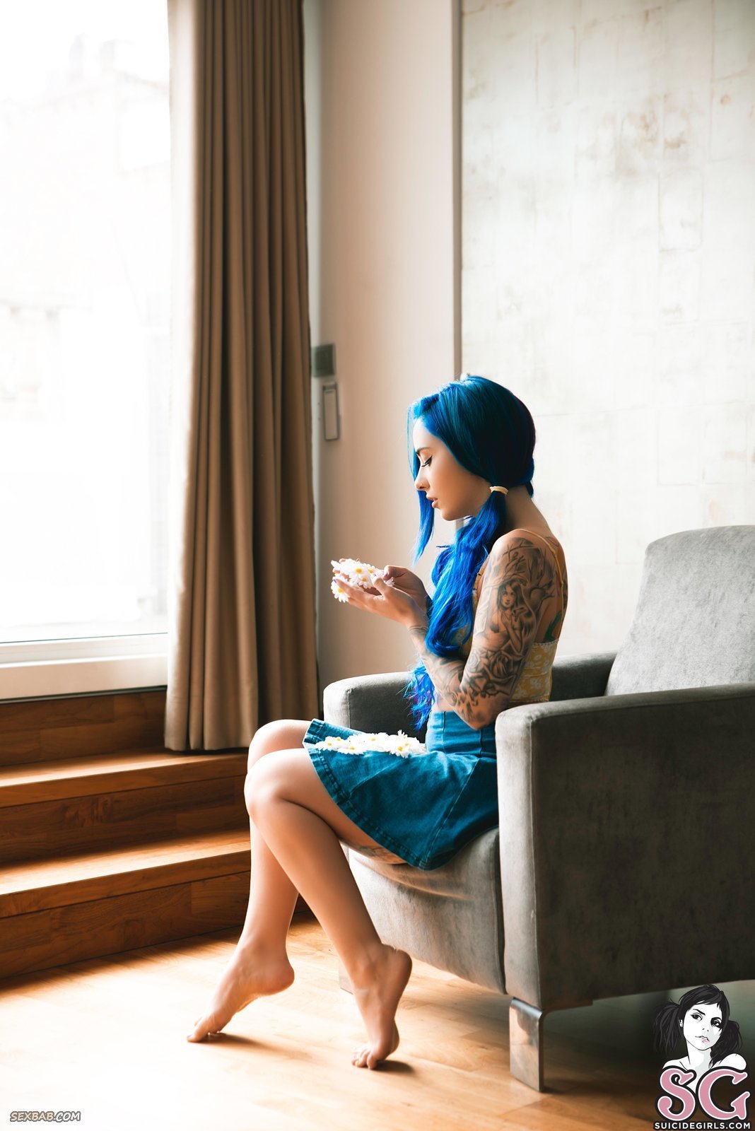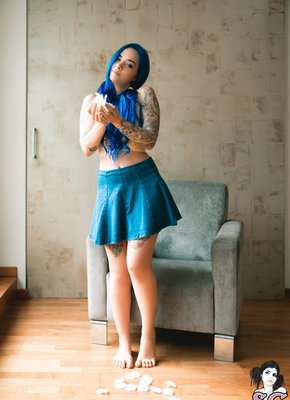 Описание: Босая милая неформалка с синими волосами в неглиже, надев юбку с трусиками и топик, эротично позирует дома и улыбаясь строит глазки в камеру. Соблазняя нас своим скромным взглядом, сексуальная модель вскоре раздевается догола и предстаёт перед нами во всей своей красе, смущённо прикрывая маленькие сиськи и скрещивая ноги.