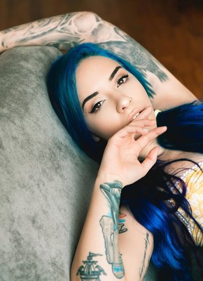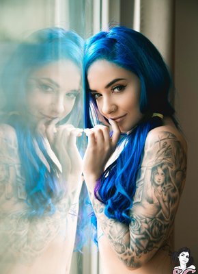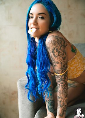 Неформалка с синими волосами в неглиже