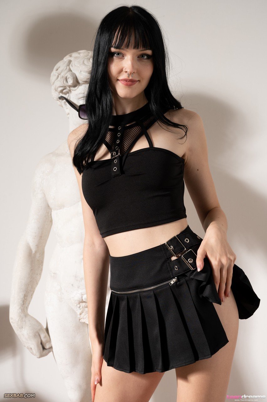 Шаловливая тёлочка разделась возле статуи и хорошенько потеребила свою выбритую пизду (20 фото)